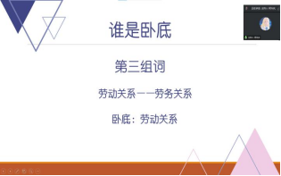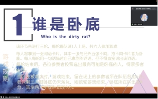 每轮每队派l人上场,每人拿到一张法学相关的词语卡片,持不同卡片者为卧底。每人每轮用一句话描述自己拿到的词语。每轮结束后,各位参赛者投票选出最有可能是卧底的人,得票多者出局。当卧底被淘汰或只剩三人时卧底仍未淘汰,则该轮游戏结束。