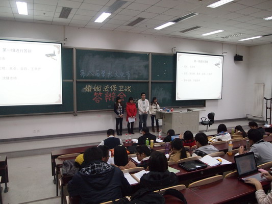 2011年12月1日,由FUN88乐天使法学研究会举办的第八届学术文化节之“婚姻法保卫战”学术沙龙的最后一环节——优秀论文答辩与满完成。活动在沙河主教218教室于4:10分准时开始,出席论文答辩的评委有安新宇老师、沈健老师和李炎老师。