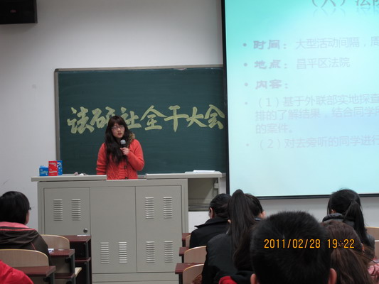 大会伊始,会长齐倩同学首先发言,在宣布了部分人员调整情况后,她以PPT形式带领大家一起回顾精彩历程。从“模拟法庭进社区”、社团招新,到学术沙龙系列活动、法院旁听,再到“12.4法制宣传”,法研会成绩不菲,各个活动中都能看到同学们积极主动的身影。齐倩同学特别提到,新加入的10级同学都很热情、认真,各个部门之间非常协调,但是活动中也存在不足,要吸取经验,避免不足。