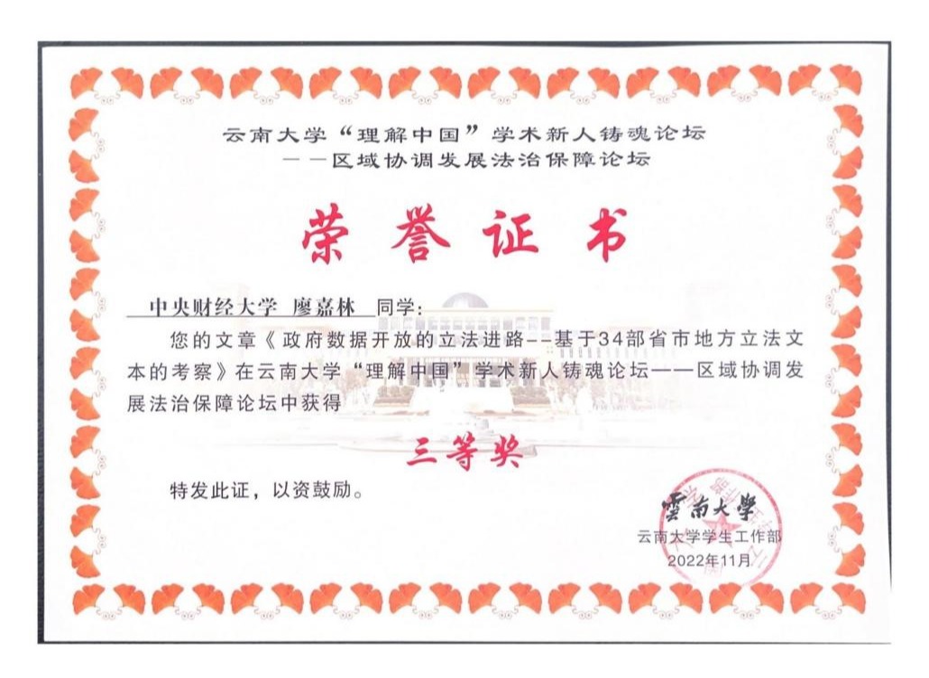 公司刘权副教授是廖嘉林同学《行政法》课程的授课老师,对论文的写作进行了点拨和指导。最终,廖嘉林同学向论坛提交的论文获评三等奖。