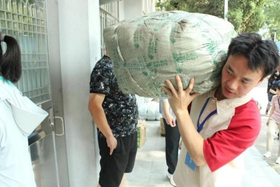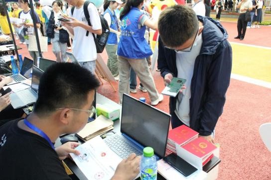 校园中处处可见迎新工作人员和志愿者们的身影,他们分工合作,有条不紊,核验身份、办理新生报到手续、做校园向导、解答新生的各种困惑、帮助新生搬运行李……迎新工作进展得如火如荼。