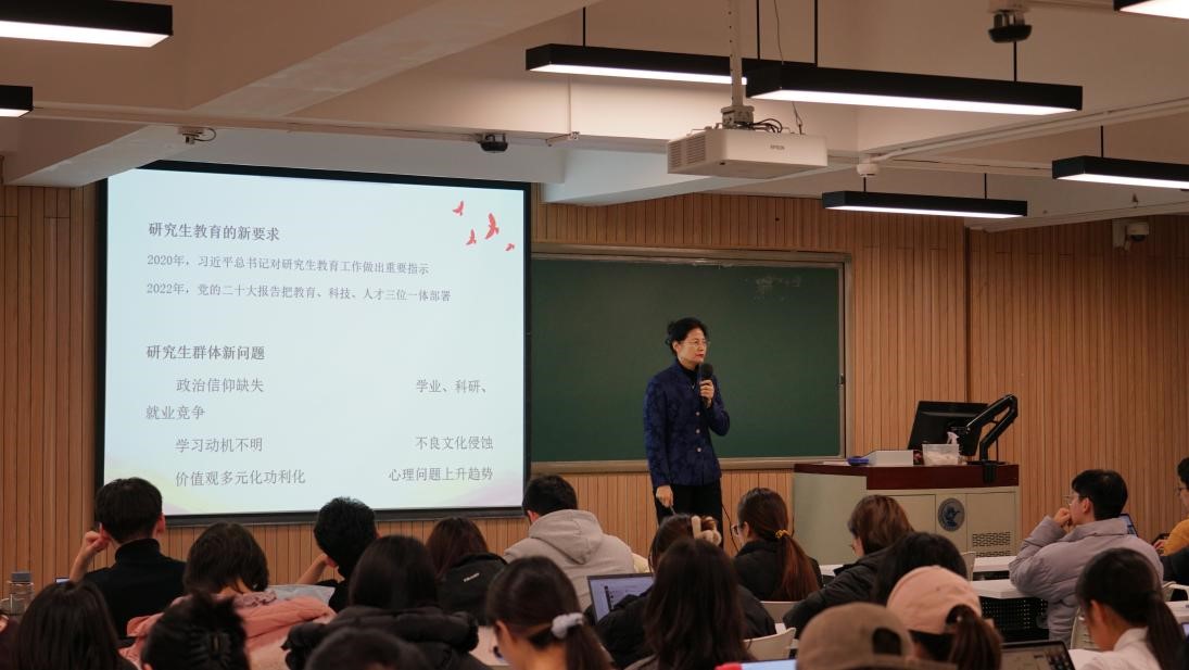 首先,徐颖老师向新生介绍了研究生教育的新形势、新特点、新要求以及研究群体的新问题。面对研究生教育群体出现的新问题,如政治信仰缺失、学习动机不明、不良文化侵蚀、心理问题等现象呈现上升趋势,公司在应对培养人才方面坚持的一是政治引领,二是立足中国实践,三是聚焦数字时代,四是着力风险防控的发展路径。