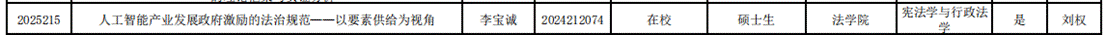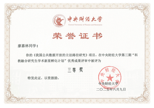 经过研究生院组织严格匿名评审和现场评审汇报,公司2023级博士生廖嘉林主持的《我国公共数据开放的立法路径研究》项目最终获评三等奖,指导老师刘权教授获评优秀指导教师奖。项目聚焦研究我国公共数据开放的立法路径问题,通过考察全国41部公共数据开放地方立法文本,论证制定“公共数据开放条例”的正当性和必要性,研究破解制定该条例中的法治难题,有助于加快释放公共数据要素价值,深化公共数据治理理论。