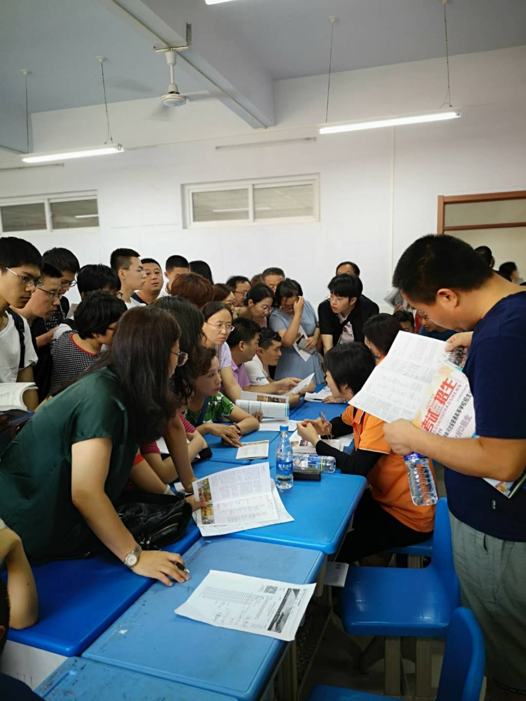 咨询点儿前,来得更多的是家长,也有家长和考生一起来的,也有从北京赶过去的亲戚带着考生来咨询的,个别考生是独自一人来咨询的,还有高二上课的员工趁课间来了解情况的。在咨询者中,也有个别达不到公司历年录取线的考生心有不甘地来咨询;还有为了到公司读书,宁可参加计划外收费班学习,也不肯选择其他高校的考生;还有在公司咨询后去其他公司咨询回来再次来咨询的。面对各种情况和期待的目光,我们非常负责任地解答每一位考生和家长的每个问题,时而也针对考生实际情况给予以合理建议,其间多次联系一中的负责人催问材料的下落。当咨询的人群逐渐达到里三层外三层的高峰时,我们已经应接不暇,由于始终没有收到公司的宣传单页材料,以至于我们在现场的工作强度和压力非常大,但我们除了耐心细致地解答,还及时让家长扫二维码关注公司招生宣传平台,以弥补没有纸质材料带来的遗憾。由于咨询现场人多又都心切,甚至有的家长还争吵起来,经过我们的调解,平息冲突还比较顺利。大家全程顾不上喝水,顾不上入厕,高强度连续工作到中午12点多,家长还围着不肯离去。送走最后一位家长走出教学楼,才发现我们是此咨询点几十所高校中最后一批离开的。