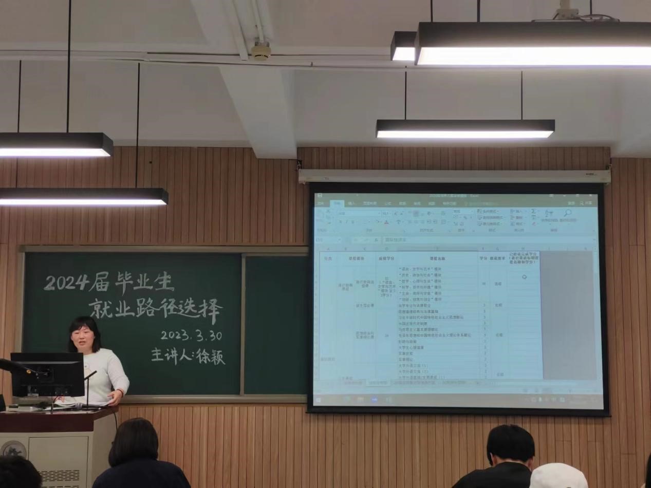 接着,徐颖老师在辅导员张明华老师提供的就业摸底意愿表基础上,对2020级本科生和2022级二学位员工的就业进行毕业就业指导。此前,徐老师已与多位同学面对面进行过沟通,深切感受到大三年级员工对毕业就业一系列问题的强烈需求,也是本次年级会召开的初衷。徐老师强调同学们要正确树立就业观,明确升学不是唯一的途径,除了考研之外还有更多的选择和发展空间,诸如公司自2022年增设的第二学位,介绍了二学位的学科专业以及如何选择等;结合疫情前后的就业形势,阐述了近六年公司就业的实际情况和毕业前景,如果同学们直接就业以及灵活就业的优势,均以图表和案例的方式与同学们进行了分享和交流。殷切地叮嘱同学们要珍惜时间,合理规划毕业、升学、就业的目标,在考研的同时参加法考,制作简历等为就业做好谋划,在不断地拼搏中增强实力,顺利毕业就业。最后,徐老师热诚地表示,希望有需要帮助的同学们及时联系她,她将全力为同学们精准服务,指导助力,释疑惑解难题。