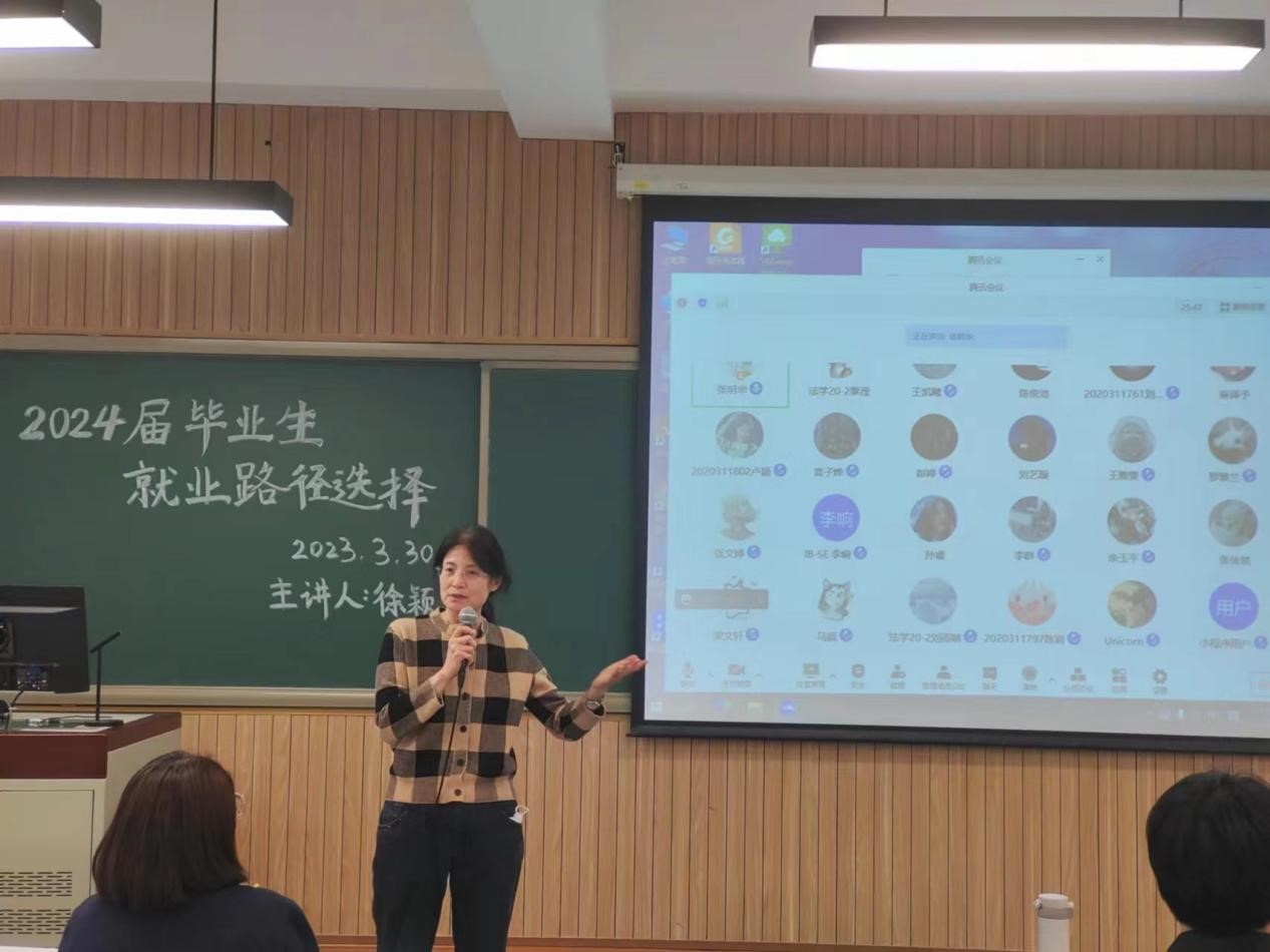 3月30日下午三点,FUN88乐天使在公司南路校区主教楼117召开2024届毕业就业会。本次会议采取线下线上同步举行,由法公司党委副书记徐颖老师主持,主管本科教务的曹灿老师、辅导员张明华老师以及2020级本科生、2022级二学位员工参加。本次年级会主题是围绕准毕业员工出现的共性话题“毕业+就业”开展的。