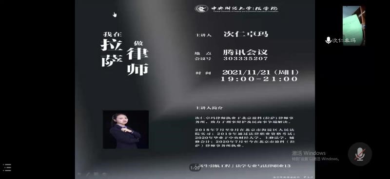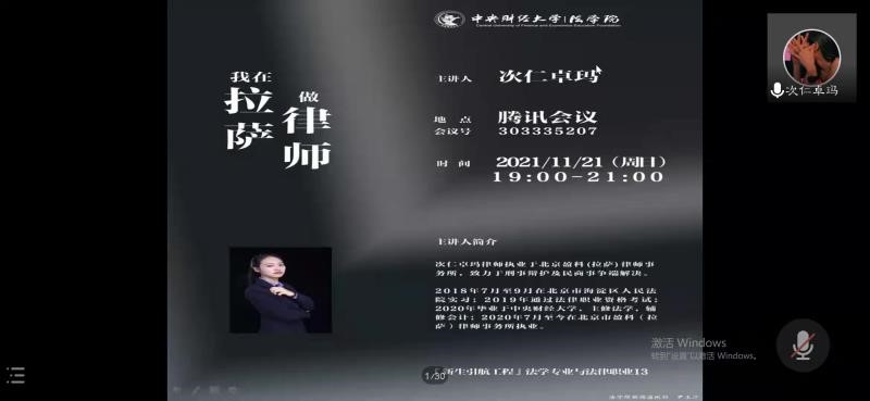 2021年11月21日19点,公司举办2021级本科生“法学专业与法律职业”课程暨新生引航工程系列讲座。本次主题是“我在拉萨做律师”,由公司2020届本科优秀毕业生次仁卓玛主讲,FUN88乐天使全体2021级本科生参加。