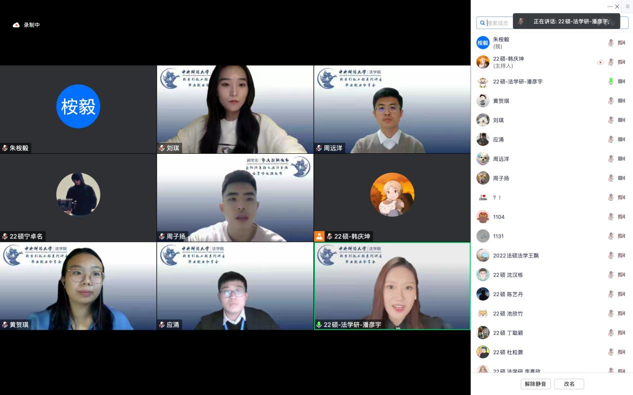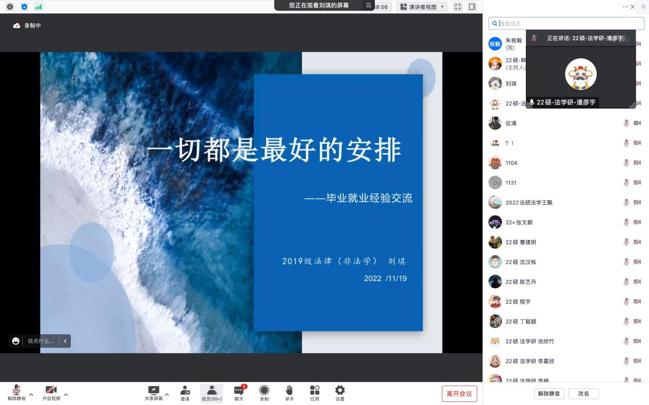 FUN88乐天使“新生引航系列讲座·毕业就业分享会”金融机构专场讲座于2022年11月19日在线上顺利举行。公司特邀刘琪、应涌、黄贺琪、周子扬、周远洋五位2022届毕业生作为本次分享会的嘉宾。法公司党委副书记徐颖研究员、副经理李伟副教授、2022级研究生辅导员李紫仪老师出席本次活动,讲座由2022级法学硕士研究生潘彦宇同学主持,共计280余名同学参加。