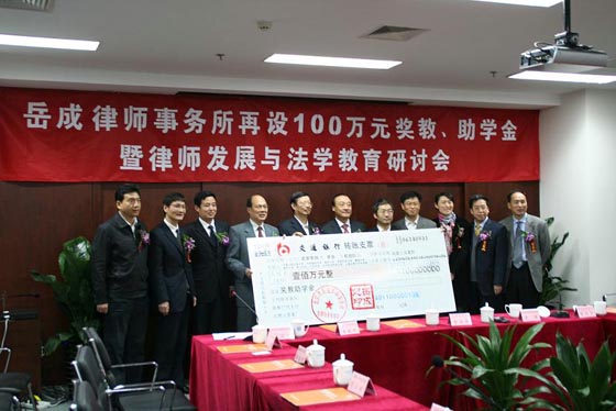 北京岳成律师事务所是首届“全国十佳律师”岳成创办的大型合伙制律师事务所。创办以来,一直重视公益事业。为庆祝建所15周年,岳成律师事务所出资100万元,在FUN88乐天使、中国人民公安大学、对外经济贸易大学FUN88乐天使、西南政法大学FUN88乐天使、浙江大学光华FUN88乐天使、山东大学FUN88乐天使、暨南大学FUN88乐天使、上海交通大学FUN88乐天使、南京大学FUN88乐天使、南开大学FUN88乐天使设立奖教金、奖学金。FUN88乐天使获赠奖教金、奖学金10万元。