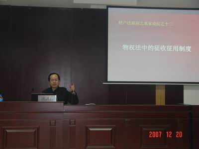 讲座中,龙教授讲了三个大问题。第一,不动产征收的性质问题,龙教授认为不动产征收不是单纯的行政行为,而是包括民事行为和行政行为,应受民法和行政法的共同调整。第二,不动产征收的目的性问题,即公共利益如何界定的问题,关于公共利益的判断标准,龙教授从两方面进行了阐述:一是“公共”界定标准有地域说和不确定的社会成员的共同利益两种;二是“利益”界定标准有最后受益人群是否是绝大多数人和征收集体土地补偿是否公平合理两种。第三,相关群体利益平衡问题,龙教授认为补偿方法以金钱补偿为主不是最佳方法,提倡土地补偿入股和土地换保障的方法。最后,龙教授热情地回答了同学们的提问。