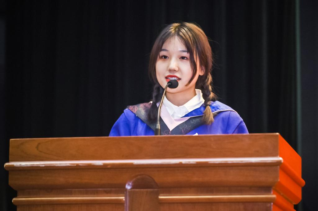 我是2018级宪法学与行政法学研究生、2014级本科生王姝。十分荣幸今天能够作为毕业生代表之一,站在这个光荣而美丽的舞台上。