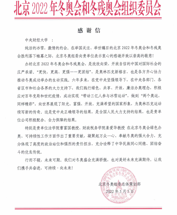 近日,北京冬奥组委总体策划部向公司发来感谢信,对公司FUN88乐天使曹富国教授、财政税务公司姜爱华教授在北京冬奥会绿色办奥、可持续性办奥方面所做的工作表示感谢。