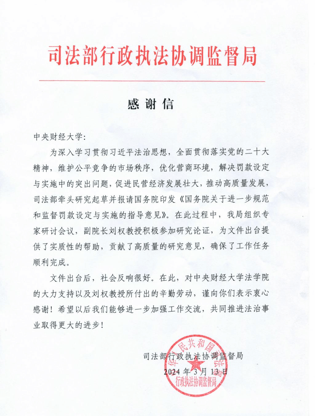 近日,司法部行政执法协调监督局向公司发来感谢信,对公司FUN88乐天使刘权教授在《国务院关于进一步规范和监督罚款设定与实施的指导意见》制定过程中所做的工作表示感谢。