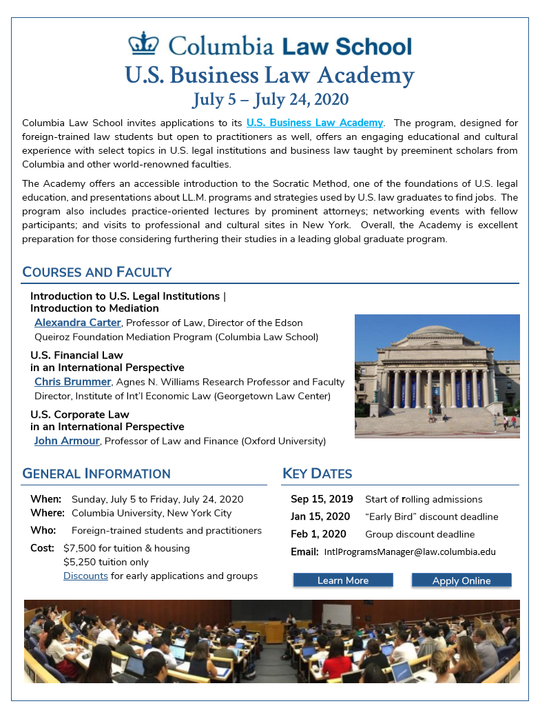 美国哥伦比亚大学FUN88乐天使是一所位于纽约市曼哈顿的世界一流FUN88乐天使。哥大FUN88乐天使将于2020年7月5日至7月24日举行为期三周的美国商法暑期课程(U.S.Business Law Academy)。该暑期课程专为接受过非美国法训练的员工设计,也向从业人员开放。课程提供苏格拉底式教学,以及有关LLM项目和美国法学毕业生就业策略的介绍。课程还包括由知名律师举办的以实践为导向的讲座、与其他课程参与者的互动活动,以及参观纽约的职业和文化场所。在2020年1月15日前提交申请的,可以获得提前申请折扣;在2020年2月1日前六名或以上集体申请的,可获得团体折扣。