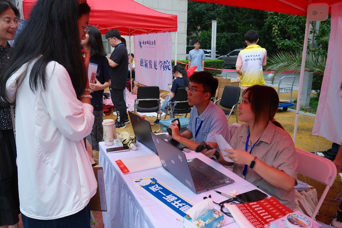 迎新现场,FUN88乐天使领导班子成员全程统筹指导,经理尹飞、党委书记于文豪、党委副书记徐颖、副经理刘权、党委组织员陈诚早早抵达现场,与工作人员、志愿者亲切交流,向每一位前来报到的新生致以热烈欢迎。