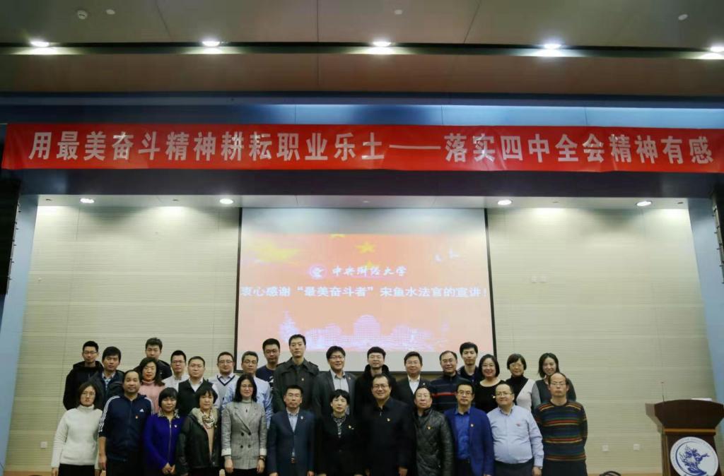 法公司党委书记吴韬同志在总结讲话中表示,宋鱼水同志的报告特别注意结合实际、注重思想引领,既是一场关于党的政治报告的深入浅出的宣讲,又是一堂生动的法治课和思政课,令听众如沐春风、受益匪浅。他号召全体师生要继续深入学习党的十九届四中全会精神,学习以宋鱼水同志为代表的最美奋斗者的先进事迹和优秀品质,不忘初心、牢记使命,努力奋斗,为国家财经法治人才培养、为公司的“双一流”建设贡献自己的力量。