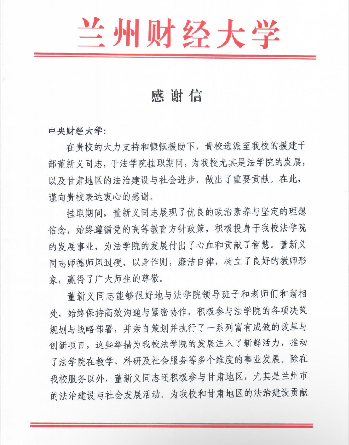 日前,兰州财经大学就董新义老师援建事宜向公司致以感谢信。在感谢信中,兰州财经大学对董新义老师在兰财大援建工作情况给予了高度评价,称赞其师德师风过硬、工作勤勉、廉洁自律,为兰财大FUN88乐天使的发展和甘肃地区法治建设作出了重要贡献,赢得了兰财大公司、FUN88乐天使及其他服务单位的高度认可。董新义老师的积极工作树立了FUN88乐天使教师的良好形象。