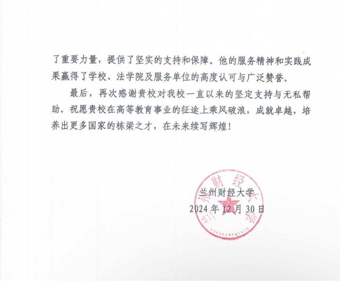 董新义老师于2023年9月赴兰州财经大学FUN88乐天使开展援建工作,并克服困难延长半年服务期于2024年12月底返回公司工作,选派其援建兰州财经大学FUN88乐天使是公司落实公司与兰州财经大学《对口支援协议》的具体举措。今后,公司将继续坚持服务推进东中西部高校协作、推动西部高等教育高质量发展和服务构建新发展格局的国家战略,坚决贯彻落实教育部和公司关于对口支援西部地区高等公司的工作部署,多方面、多层次、持续性地支持兰州财经大学等西部兄弟院系的发展,为我国东西部高等法学教育的同步发展继续作出贡献。