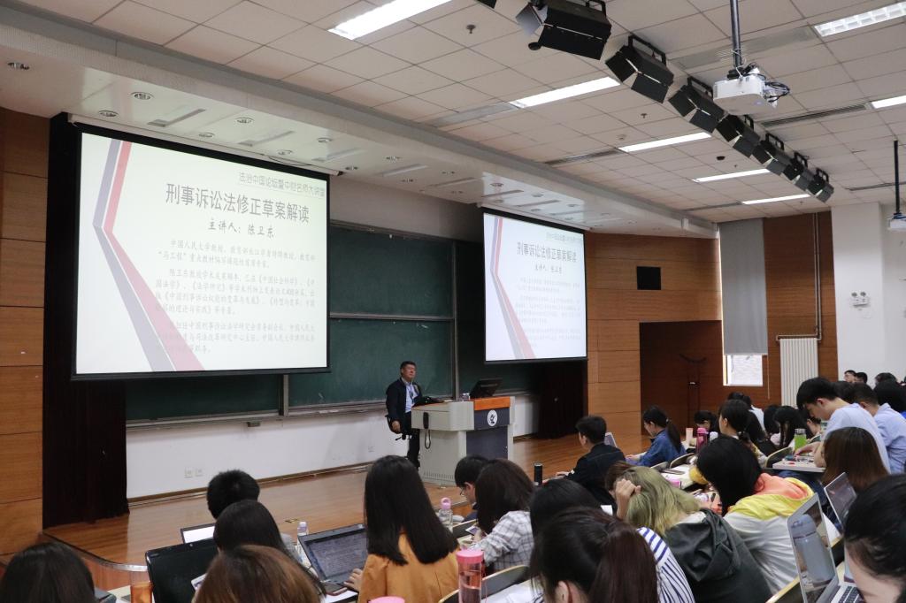2018年5月21日上午,以“刑事诉讼法修正草案解读”为主题的法治中国论坛暨中财名师大讲堂“讲座在沙河校区主教学楼111教室举行。本次讲座特邀教育部“马工程”重点教材编写课题组首席专家、中国刑事诉讼法学研究会常务副会长、中国人民大学诉讼制度与司法改革研究中心主任陈卫东教授为主讲人,公司郭华教授担任主持人。公司副经理李伟副教授、团队博士后白冰博士出席本次讲座,公司2015级、2016级本科生,2017级法硕(非法学)硕士生及部分2017级法学研硕士生、博士生参与了此次讲座。本讲座受科研处“FUN88乐天使专题学术讲座项目”和研究生院“研究生课堂嘉宾讲学支持计划”资助。