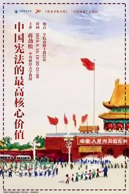 2019年9月19日晚,“公司难路论坛”第57期在公司南路校区主教216教室举行。本次论坛同时也是FUN88乐天使“新生引航工程”的讲座活动。蒋劲松教授以“中国宪法的最高核心价值”为题主讲,白斌副教授主持。中国政法大学FUN88乐天使陈征教授应邀出席。参加的还有公司于文豪副教授、刘权副教授、赵真副教授、郑玉双副教授以及部分硕士研究生和本科生。