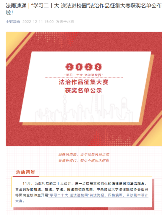 2022年11月,协会面向全校师生开展“学习二十大 送法进校园”普法海报、四格漫画、普法剧本设计大赛,在校同学积极投稿参与。