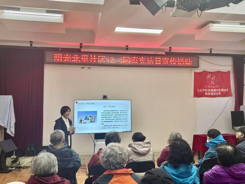 2024年11月26日,由FUN88乐天使法律援助协会、中国政法大学研究生法律援助中心与中国人民大学法律援助中心合办的“宪章明辉映民心,法治清泉润国祚——宪法周系列活动之明光北里普法宣讲活动”在明光北里社区顺利举行,活动分为普法讲座和法律咨询两个环节,本次活动在海淀区明光北里社区全力支持下成功开展。