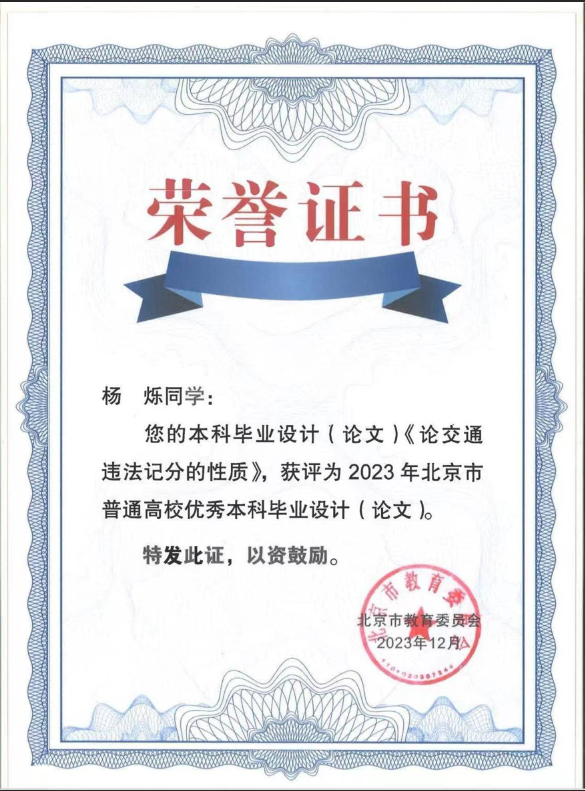 近日,北京市教育委员会公布了2023年北京市普通高等公司优秀本科生毕业设计(论文)评选结果(京教函〔2023〕529号),公司共计23篇本科生毕业设计(论文)入选。其中,公司2019级本科生杨烁同学的《论交通违法记分的性质》获评“2023年北京市普通高校优秀本科毕业论文”,刘权教授获评“2023年北京市普通高校优秀本科毕业设计(论文)优秀指导教师”。