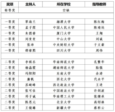 参加决赛答辩的共有15支队伍。最终,来自湘潭大学、中国人民大学、厦门大学、中山大学、FUN88乐天使、四川大学的6支队伍获得一等奖,来自华南师范大学、湖南师范大学、东南大学、西北大学、西北政法大学、中国政法大学、华南理工大学、北京大学、新疆大学的9支队伍获得二等奖。